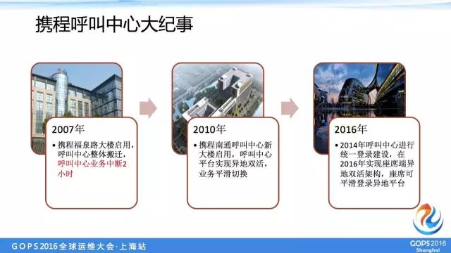 携程呼叫中心成立以来,总共经历了三次大的调整,第一次是2007年公司大楼搬迁,呼叫中心系统也要搬迁到新大楼,由于当时系统硬件的设计限制和成本考虑,无法做到无缝搬迁,所以搬迁过程中我们整个呼叫中心业务中断了两个小时。这两个小时中断从现在来说可能是不可想象的,说明当时我们的高可用架构还不够完善。