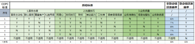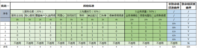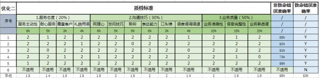 二、关于质检差错的应用 1、呼叫中心的质检差错,最初按照行业标准实施,方法如下: 致命差错准确率=1-致命差错样品数/抽查总样品数 说明:致命差错按电话单位计算。如电话里面有一个致命差错,则整通电话都不合格)。致命差错率基准值:<2%。 非致命差错准确率=1-非致命差错次数/(抽查总样品数*差错机会数) 说明:非致命差错按机会数计算。机会数是指质检标准所有项总和个数,每一项称为一个机会数。非致命差错率高基准值:<5%。 以下用简化了的质检标准进行说明: Y表示通过,N表示不通过。此处计算非致命错误准确率时,机会数总和(分母)剔除了致命错误录音的机会数(标为“不适用”)。计算致命错误准确率时,分母计算所有录音数(总数是6)。(以下图表同理) 由此公式得出:该员工非致命错误准确率89%。致命错误准确率83%。 2、不足之处。 各项质检标准项的权重是一致的,但实际上质量管理过程中,每个公司对于质量要求的侧重点都不一样。所以以上没考虑各项质检标准的影响大小。 三、优化一 1、做法:为每个质检项设置权重分数,并为每个质检项设置2个评分档:通过(分数为1)和不通过(分数为0),最终得出质检准确率。如图: 2、好处:对于公司服务质量有较大影响或公司比较重视的质检项,可以赋予较大权重,从而使质检准确率真正体现公司的服务目标。 四、优化二 1、做法:为每个质检项设置权重分数。并为每个质检项设置3个评分档:2分、1分、0分。最终得出质检准确率。如下图: 2、好处:除能体现公司服务目标外,还能统计每个质检项的优中差程度,为录音分门别类奠定基础,从而为录音库的建立提供了可参考的依据。 优化一与优化二是应用较多的两种质检差错做法。 经优化后,致命差错准确率与非致命差错准确率的基准值定多少,需要根据业务实际情况判断(如某些选项权重较大,按照行业标准基准值,做起来会有难度)。应用哪个方法,也视乎业务的具体情况而定。