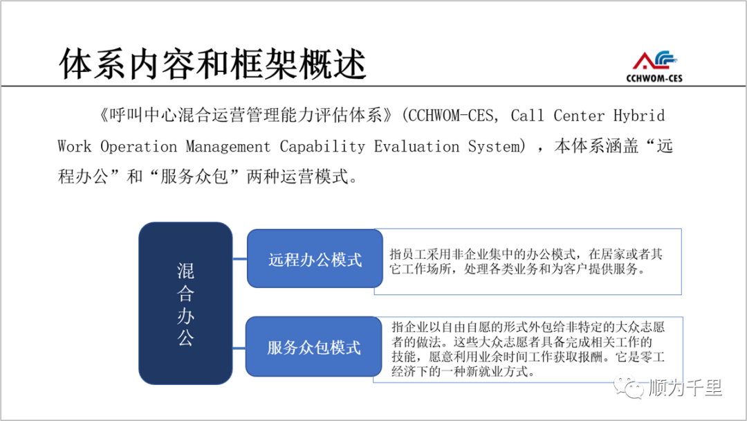 2022年8月5日,由中国信息协会数字经济专业委员会、中关村智科服务外包产业联盟,联合北京顺为千里管理咨询有限公司共同牵头的《呼叫中心混合办公运营管理能力评估体系》(“混合办公评估体系”)研究工作启动会顺利举行。
