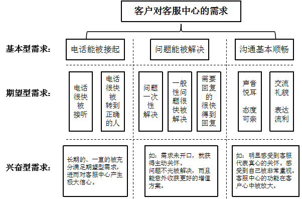 著名的质量管理大师狩野纪昭教授的KANO模型理念非常适合于分析客服中心的客户群,它将客户需求分为三个层级: